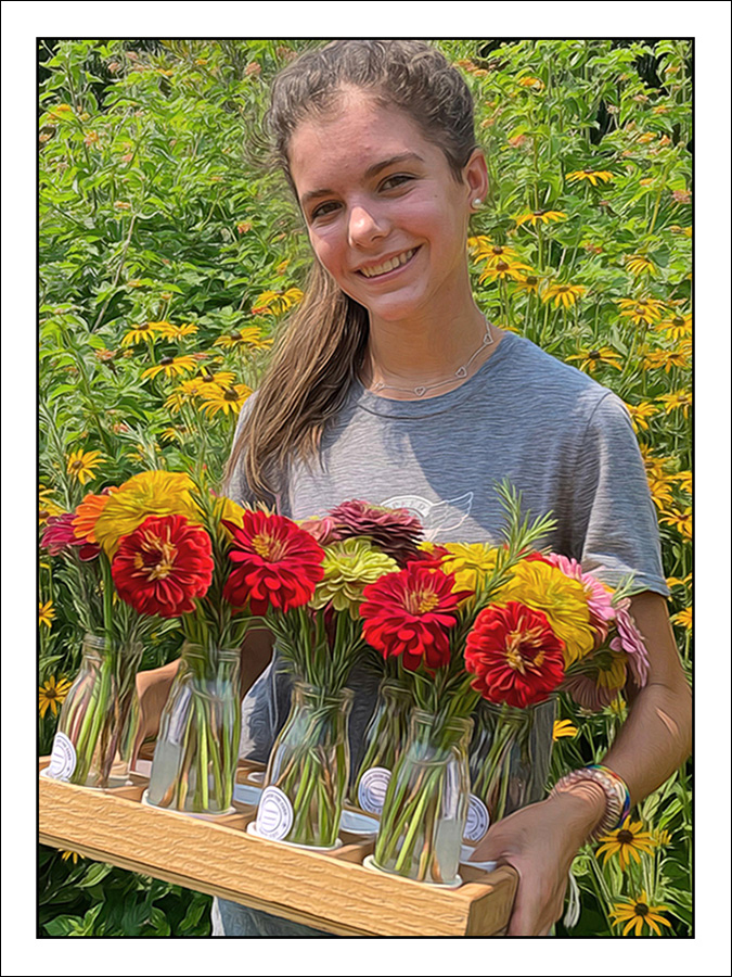 Poppy, the Flower Lass, helps gather bouquets today in the Cottage Garden.